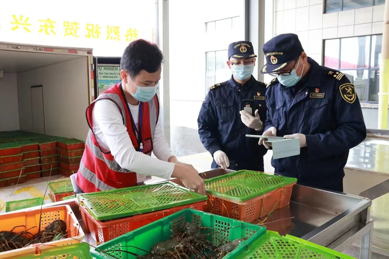 东兴公路口岸迎来首票进境龙虾通关。东兴市融媒体中心供图